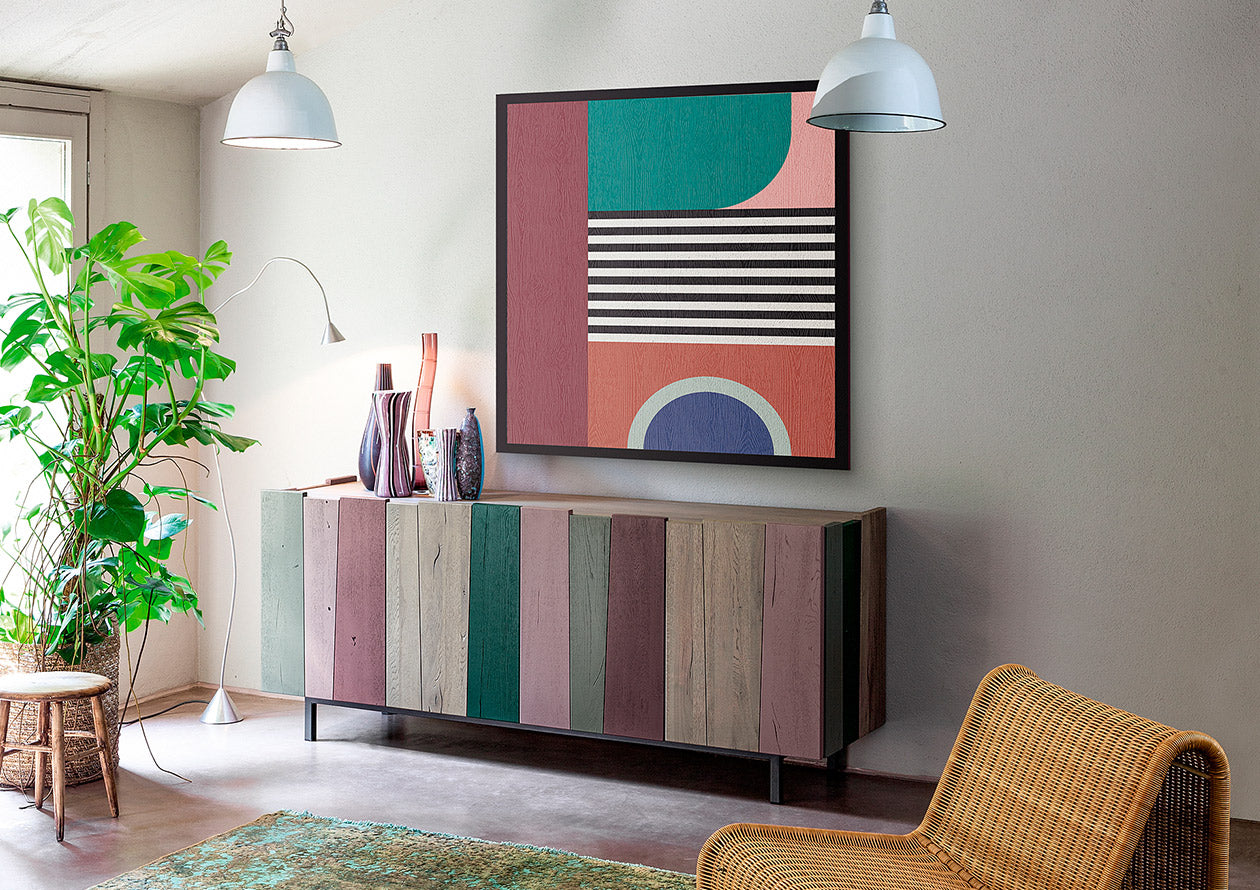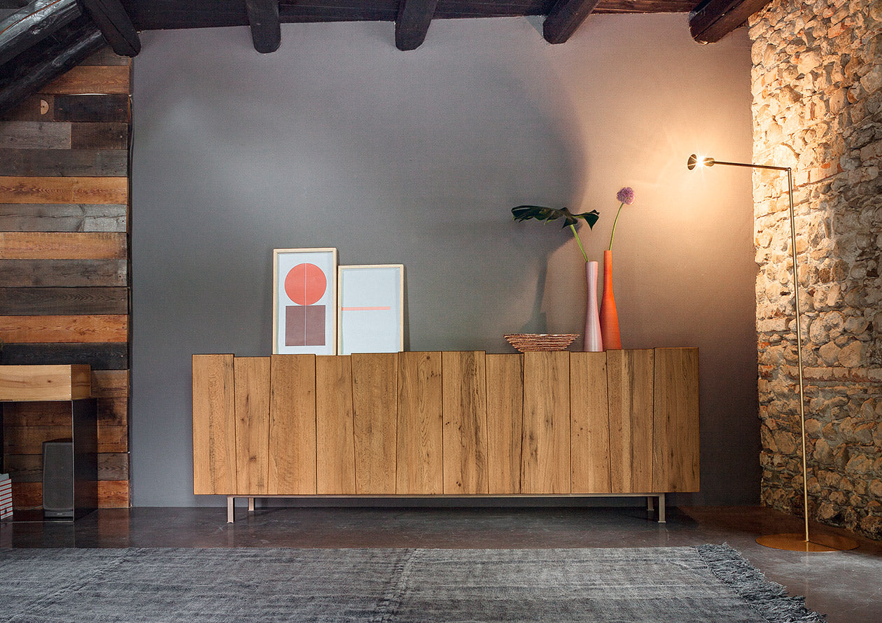 L’asimmetrica alternanza di altezze sul profilo superiore delle ante e le finiture materiche o laccate concorrono a rendere accattivante l’aspetto della madia Urban Ranch.