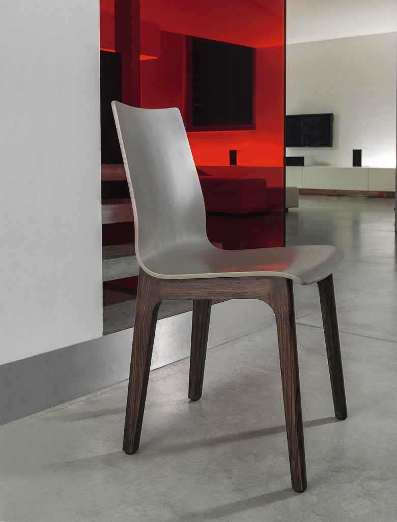 Bontempi Casa per questa sedia presenta diverse finiture per la monoscocca in legno multistrato laccato.