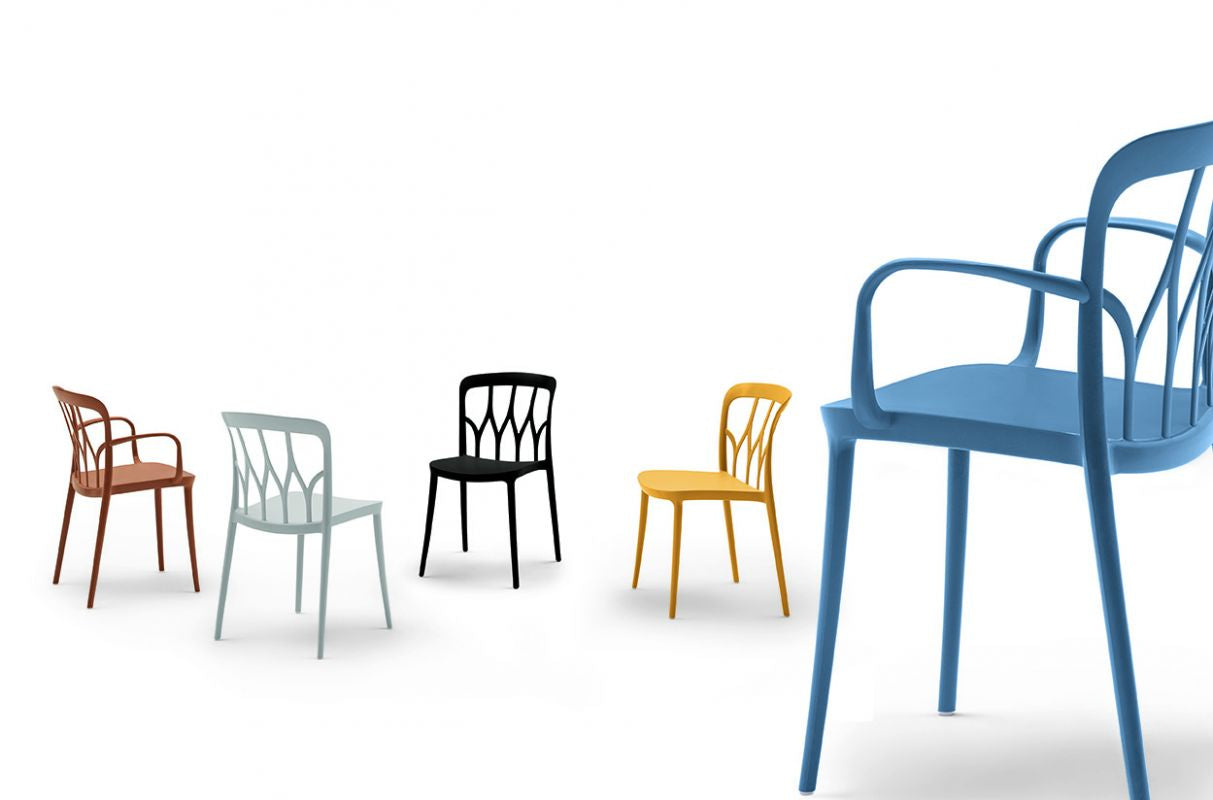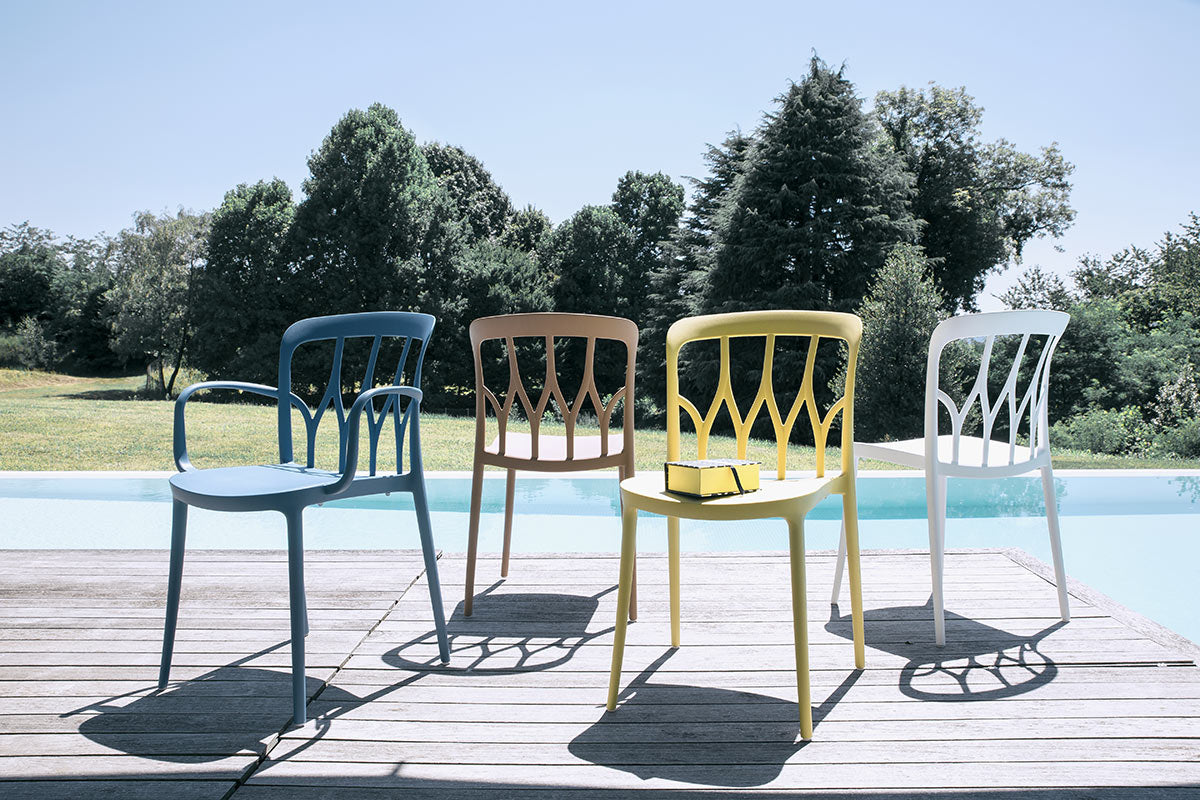 Galaxy sedia impilabile griffata Bontempi Casa proposta con struttura in polipropilene e fibra di vetro riciclabile in diversi colori