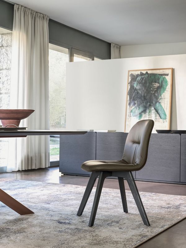 La raffinatezza della trapuntatura sulla scocca, sviluppata sulla sedia, è indice di comodità e bellezza.