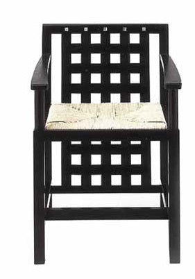 Struttura in legno di frassino laccata nera a poro aperto, seduta rivestita in pelle o corda, con braccioli.