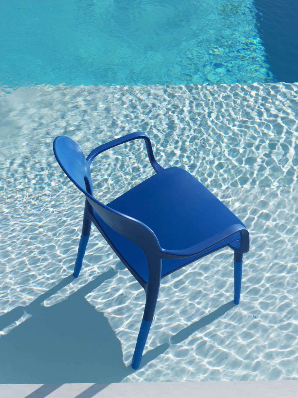 Sedia impilabile con struttura integrale prodotta con una mono iniezione di polipropilene e fibra di vetro riciclabile.