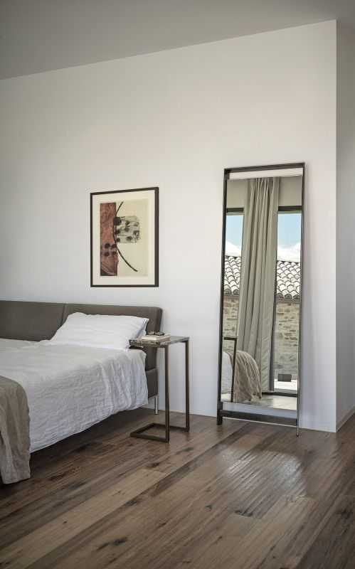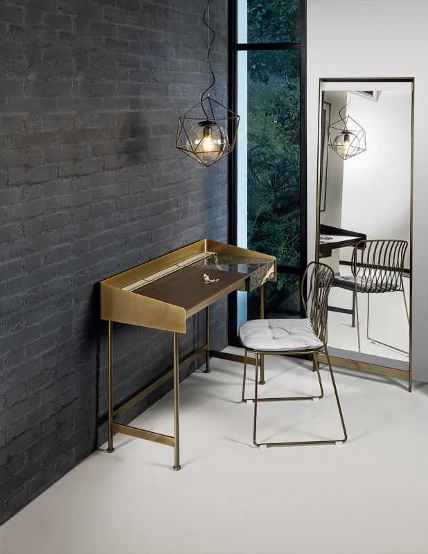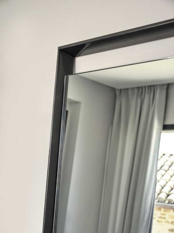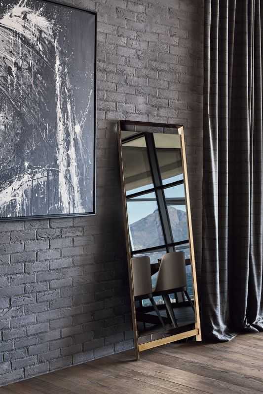 Specchio da terra con fissaggio a parete nella parte superiore in acciaio laccato in diversi colori.