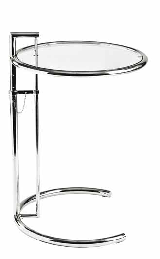 Tavolo basso con piano in cristallo, struttura cromata o in acciaio lucidata a specchio, altezza regolabile.