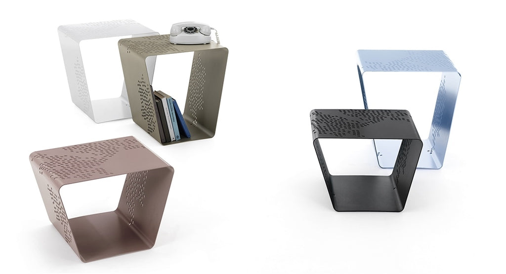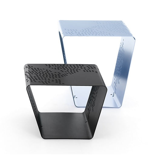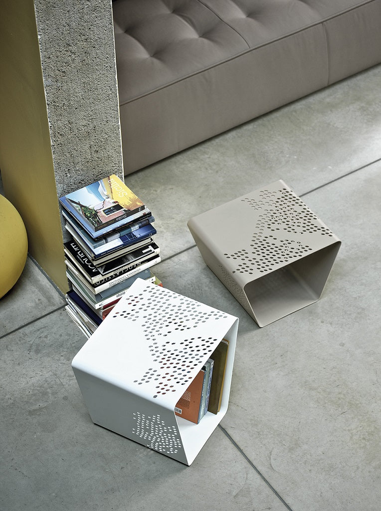 Tavolino - Pouf - Portariviste disponibile in due misure con struttura in acciaio laccato per esterno.