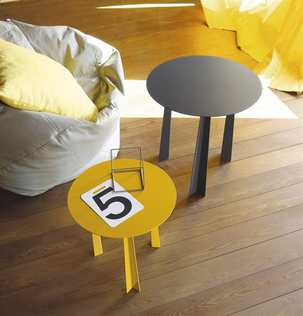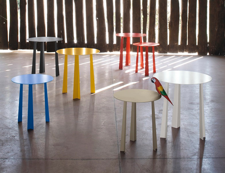 Tavolino rotondo di due misure a tre gambe con struttura in acciaio laccato per esterno.