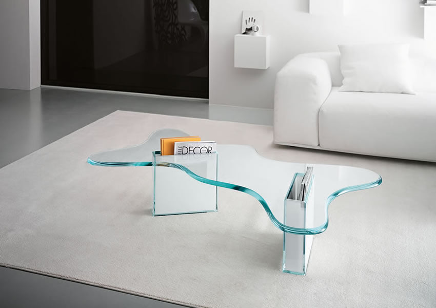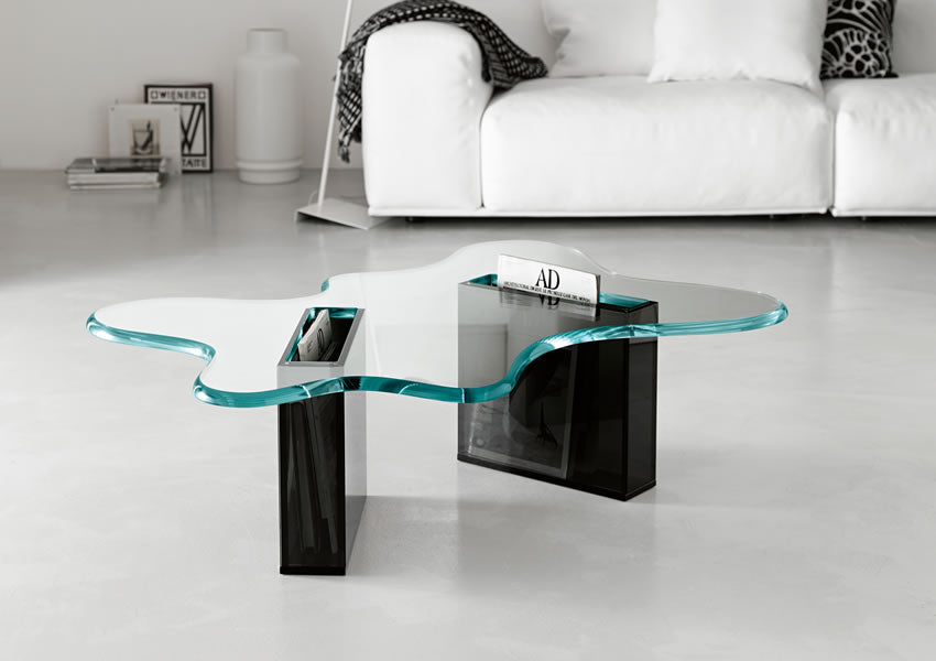 Serie di tavoli bassi in due misure con contenitori portariviste in vetro.