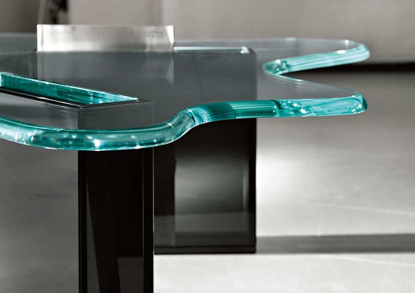 Piano superiore in vetro extrachiaro di spessore 2cm con bordo arrotondato.