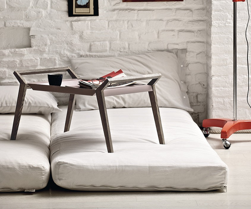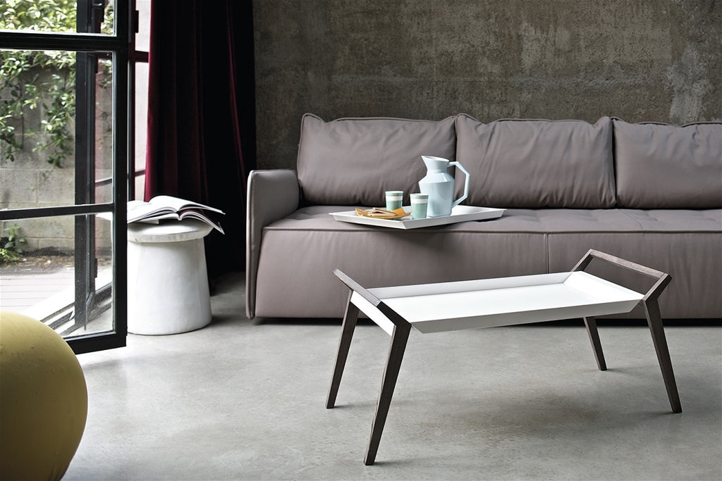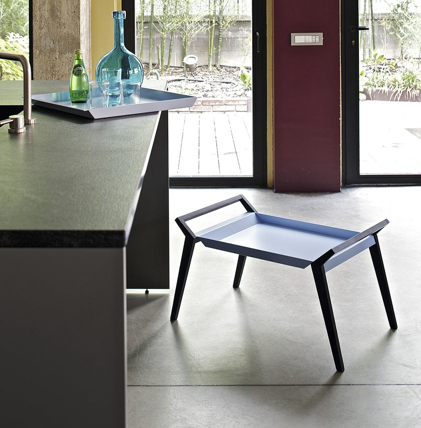 Tavolino rettangolare disponibile in due misure. Struttura in legno massello nelle essenze rovere spessart o olmo e piano in acciaio laccato in diversi colori.