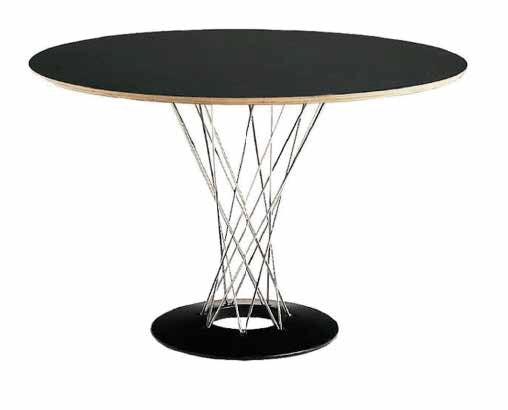 Tavolo con base in ghisa, traliccio in metallo cromato, piano laminato plastico bianco o nero.