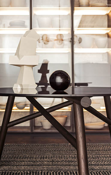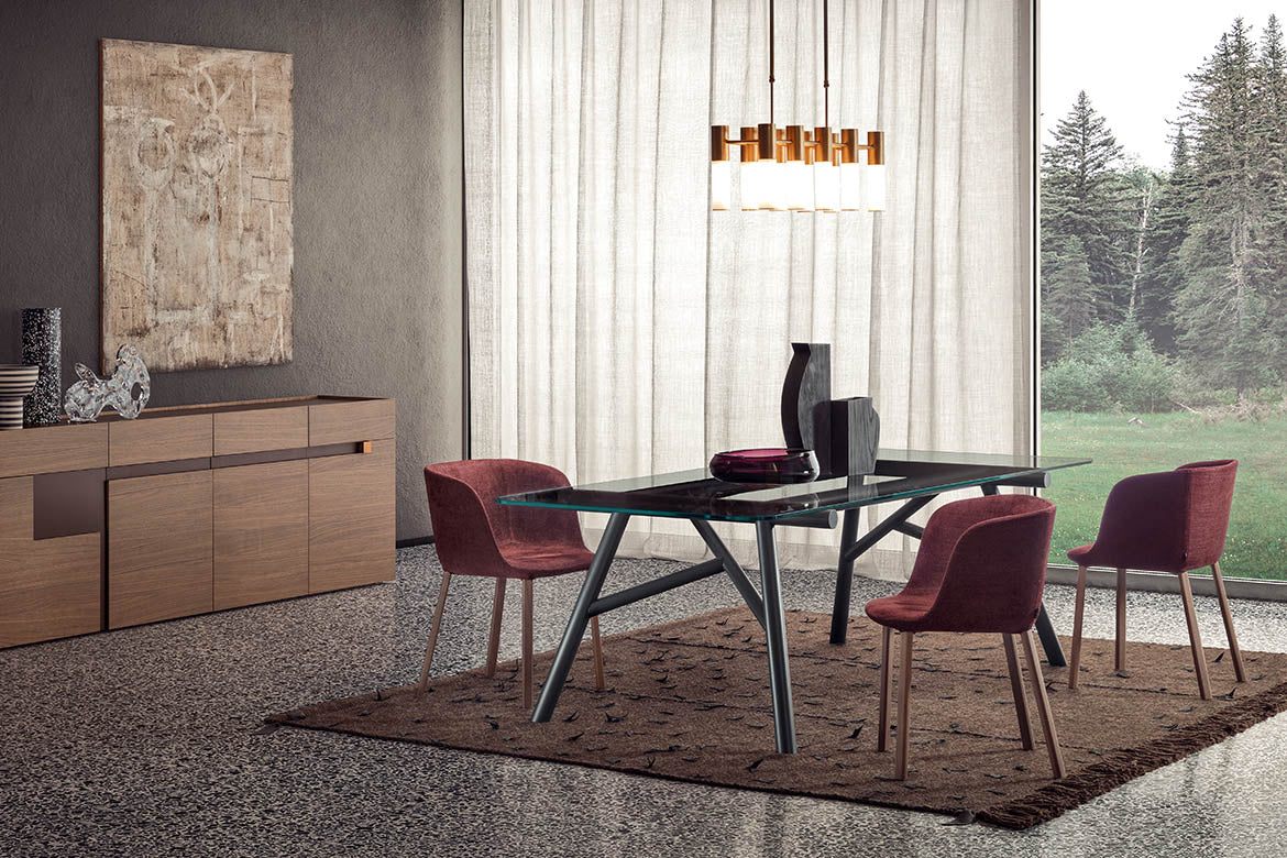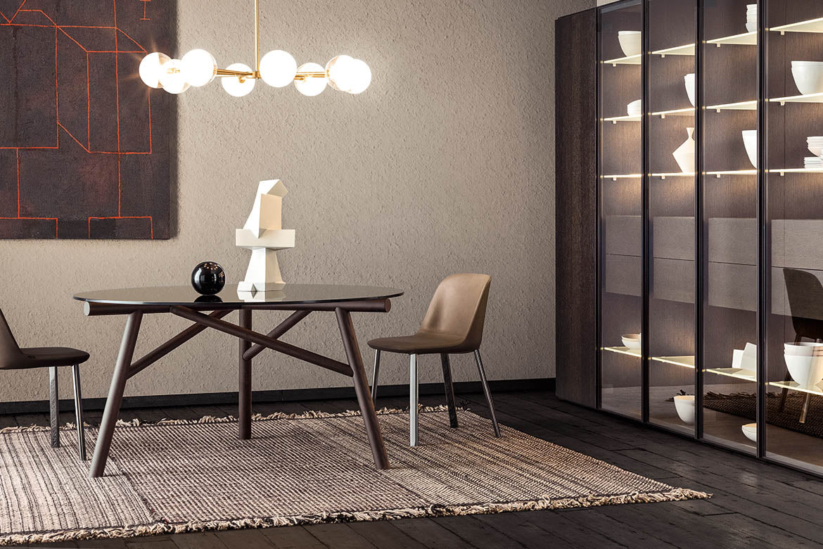 Si rinnova la collaborazione con Emilio Nanni, già autore per Pianca di Haik e Asolo. La sua formazione e la sua esperienza da architetto, unite alla versatilità con la quale esprime la propria creatività di designer ed artista, lo portano a creare progetti iconici e di grande eloquenza, come il tavolo Maestro. In un perfetto equilibrio tra concetto geometrico e stabilità strutturale, Maestro si pone come sintesi acquistando valenza estetica da questo confronto-incontro. Il segmento diventa il tratto caratterizzante del progetto, mentre, nell’insieme, delinea un disegno che richiama le travature reticolari delle capriate architettoniche. La struttura è prevista in essenza e in metallo verniciato, mentre per il piano sono state studiate le opzioni cristallo fumé e cemento naturale.