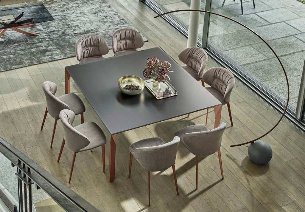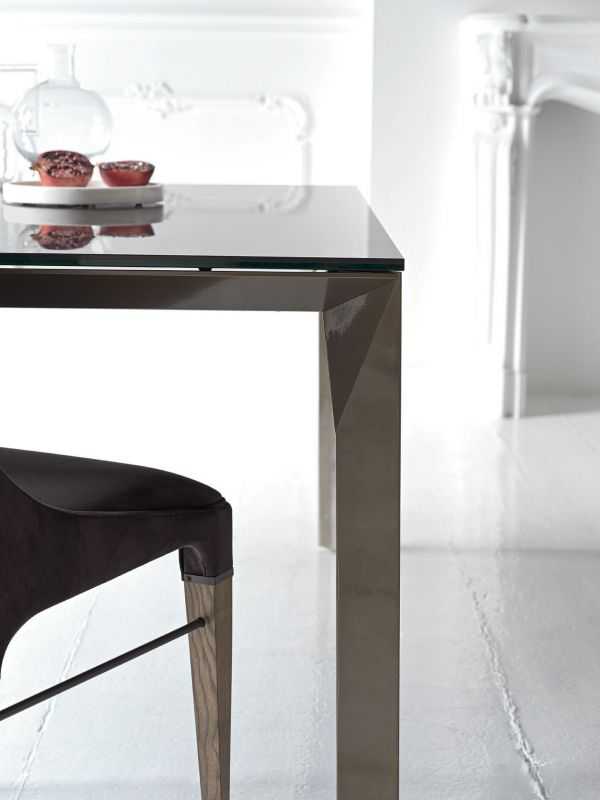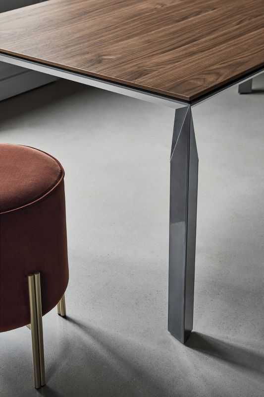 Elemento progettato nei minimi dettagli, senza lasciare nulla al caso. Struttura prestante che dona solidità al tavolo. Il piano sembra quasi librarsi sopra le gambe di quest'ultimo donandogli nella sua importanza una sensazione di leggerezza. Tavolo esteticamente di alto livello completamente personalizzabile dal telaio alle gambe.